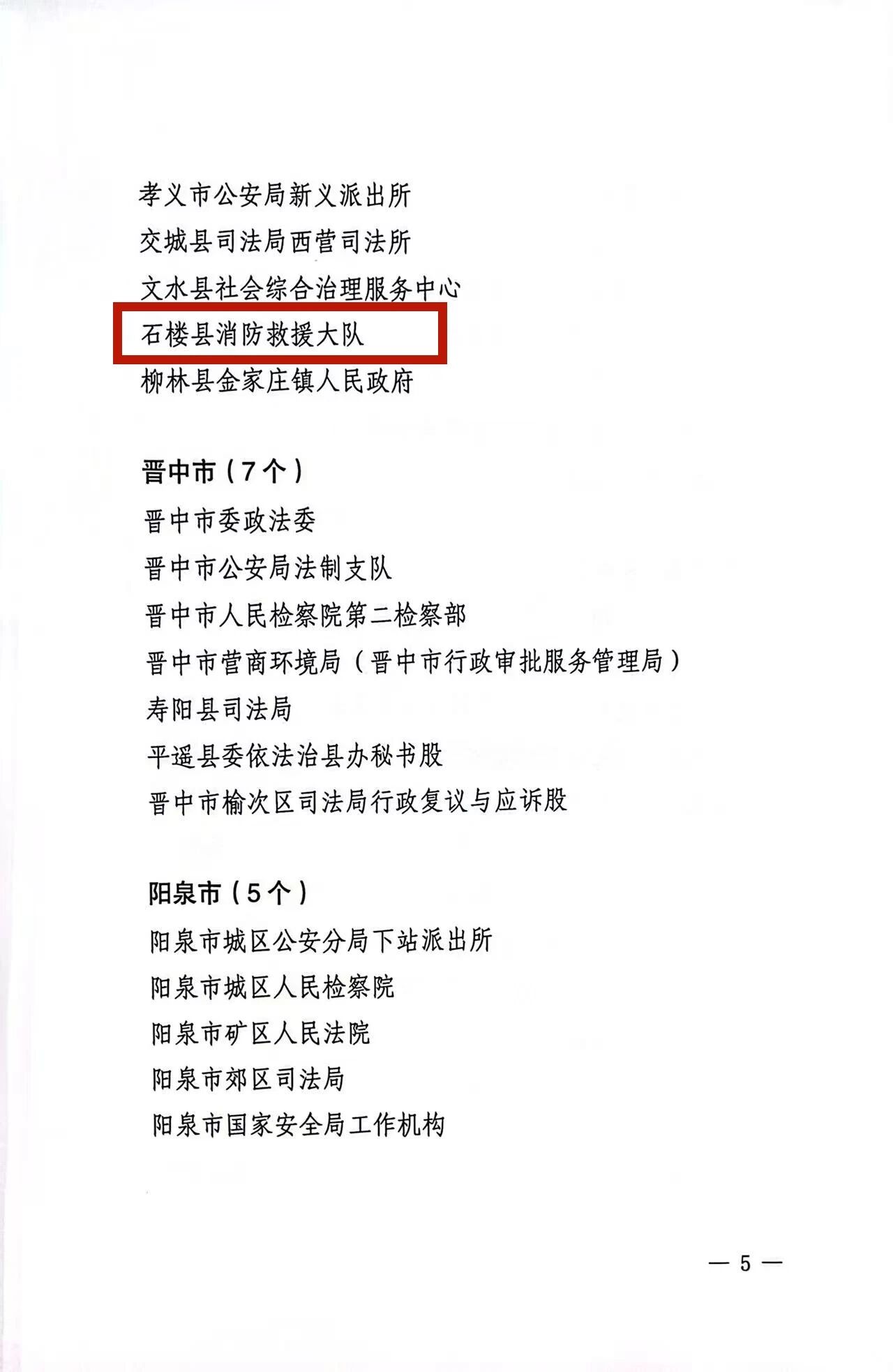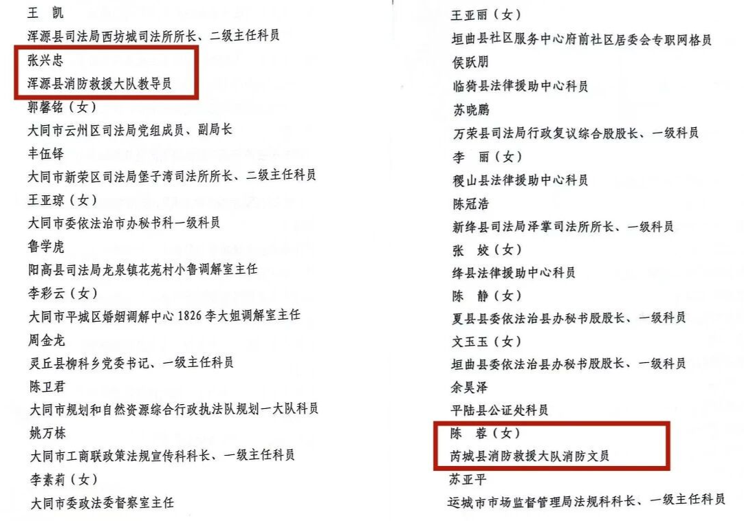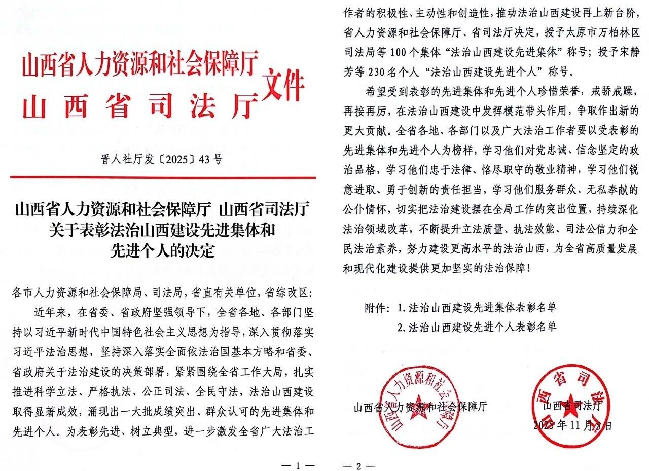 近日,山西省人力资源和社会保障厅、省司法厅联合下发表彰决定,对在法治山西建设中成绩突出的集体和个人予以表彰。山西消防1个集体获评“法治山西建设先进集体”,2名个人荣获“法治山西建设先进个人”称号。